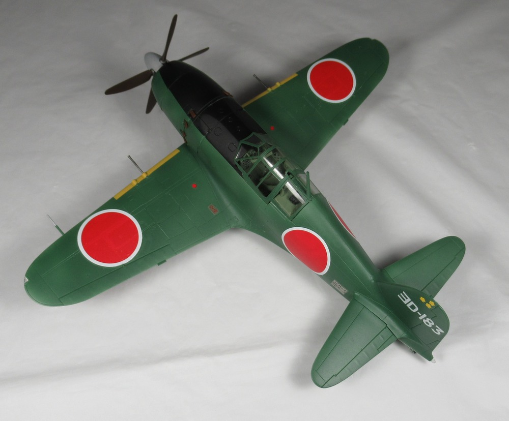 I used Quick Shine as a pre-decal gloss coat. I had intended to try something new on this kit, namely to use decals for the yellow on the leading edges of the wings. As suck, I didn't paint them. But when I double checked the decal sheet, I realized this kit doesn't come with them. Before starting this kit, I had also considered the Tamiya A6M3, which does come with decals, and got the two mixed up in my head. So I ended up painting the yellow after everything else. This is why the yellow does not go all the way to the fuselage, which it should. The yellow was AMMO (RLM 04) Gold Yellow.