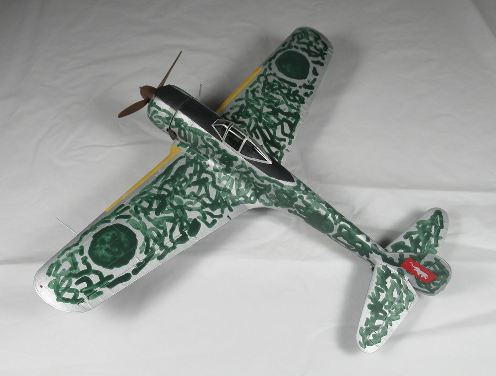 The leading edges of the wings were painted Tamiya XF-4 Flat Yellow, then masked. The entire plane was painted with Tamiya XF-16 Flat Aluminum, thinned with Mr. Color Leveling Thinner. The result less grainy than how XF-16 usually sprays, but it did seep under the masking over the yellow. I had painted over the existing yellow with AMMO Gold Yellow RLM 04. I then masked the anti-glare panel and painted it XF-1 Flat Black, thinned with Quick Shine. I often have trouble with Flat Black not adhering that well, and I was hoping the Quick Shine would help. It did, but the black seeped under the masking. I'm thinking it was the masking tape I used - just generic beige tape. I touched the Flat Aluminum up by hand. I knew it wouldn't match that closely - Tamiya never does - but I also knew the green camouflage would cover it. I applied the green using an old bottle of Model Master Acryl Euro Green I - I believe the FS number is 34092. I just used a microbrush to apply it, to try to match the drawing on the decal sheet.